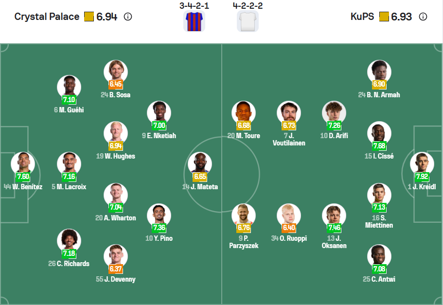 Crystal Palace có vé dự Europa League nhưng rút cục phải đá Conference League do những vấn đề về quyền sở hữu, dù vậy họ cũng không quá mạnh ở hạng đấu thấp hơn này khi chỉ có 9 điểm sau 5 lượt trận và đứng thứ 9 trên bảng xếp hạng, vị trí sẽ phải đá play off. Đội bóng nước Anh không hề muốn phải đá thêm 2 trận đấu nữa nên họ cần một chiến thắng ở lượt trận cuối cùng, qua đó hy vọng chen chân vào top 8. Đối thủ của họ chỉ là KuPS, đội bóng yếu hơn nhiều nên việc giành chiến thắng được dự đoán không khó khăn. Nhiều khả năng Crystal Palace sẽ thắng với tỉ số cách biệt.