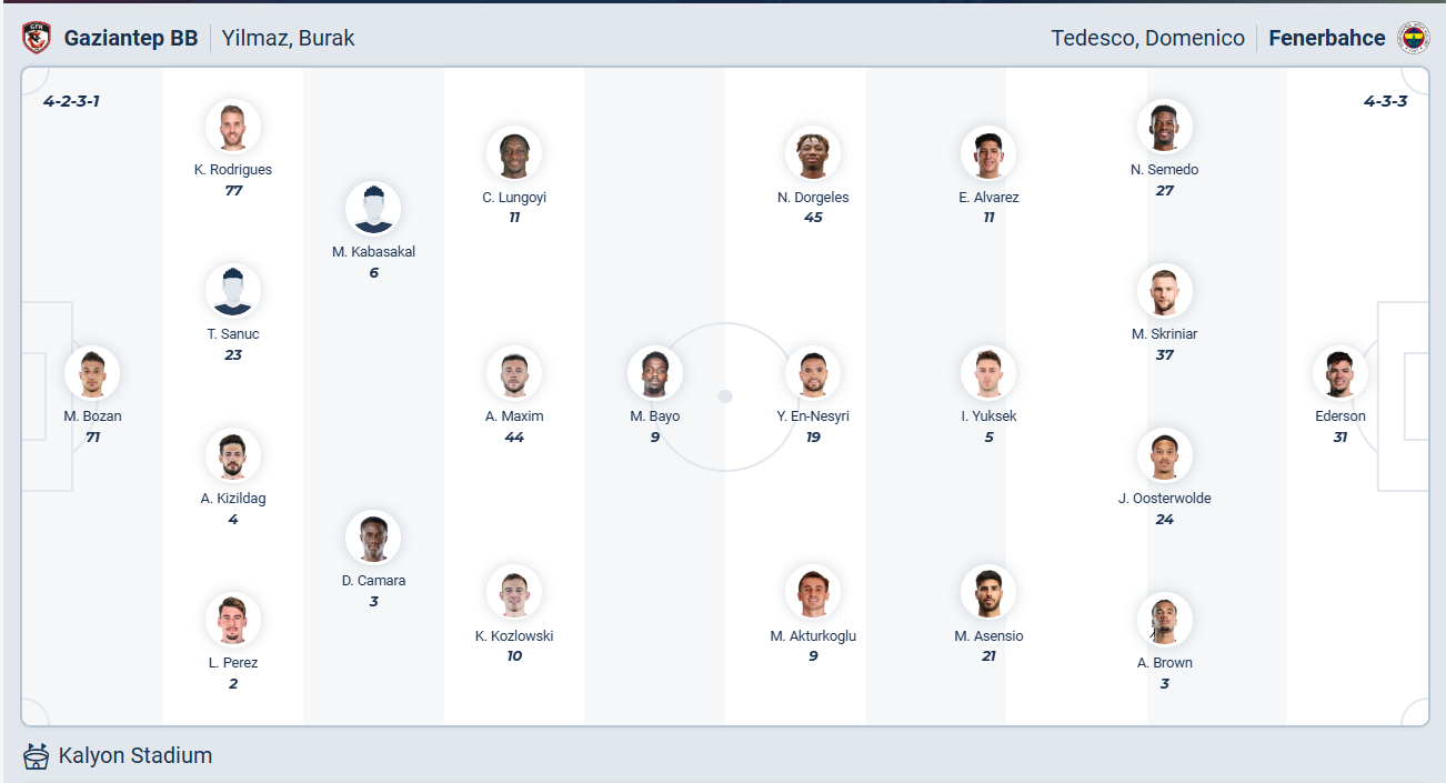 Fenerbahce đứng thứ 2 mùa giải trước và tiếp tục không thể vô địch quốc gia, mùa bóng này đội bóng của HLV Domenico Tedesco muốn làm tốt hơn nên việc đang đứng thứ 3 sau 9 vòng đấu chưa thể khiến họ hài lòng, nhất là khi đang kém đội đầu bảng 6 điểm. Các cầu thủ Fenerbahce để hòa quá nhiều nên dù vẫn bất bại nhưng điểm số không cao. Ở vòng đấu thứ 10 này họ cần phải giành chiên thắng, không chỉ để bám đuổi 2 đội xếp trên mà còn để giữ vị trí hiện tại của mình. Dù sao thì Gaziantep cũng không có chất lượng đội hình bằng Fenerbahce nên nếu đội khách chơi đúng với khả năng thì họ sẽ có 3 điểm ra về.
