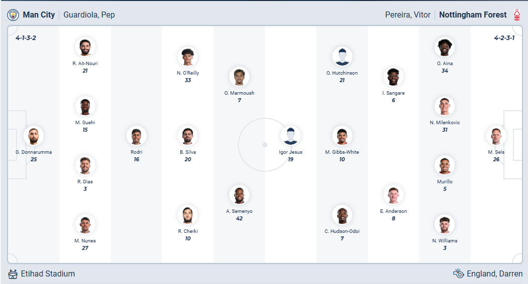 Nottingham vẫn đang loay hoay trong cuộc chiến trụ hạng sau khi đã bổ nhiệm HLV thứ tư của mùa giải, đội bóng đang được dẫn dắt bởi HLV Vitor Pereira đang đứng thứ 17 trên bảng xếp hạng, họ để thua cả 2 vòng gần nhất và không thắng trong các trận gần đây tại đấu trường quốc nội. Họ chỉ còn hơn nhóm xuống hạng 2 điểm nên bất cứ lúc nào có thể rơi xuống vị trí này nếu không giành được kết quả tốt nên các cầu thủ Nottingham cần một kết quả tích cực ở vòng 29 này. Tuy nhiên chuyến làm khách trên sân của Man City quá khó khăn, nhiều khả năng Notitngham sẽ không thể có điểm ra về.